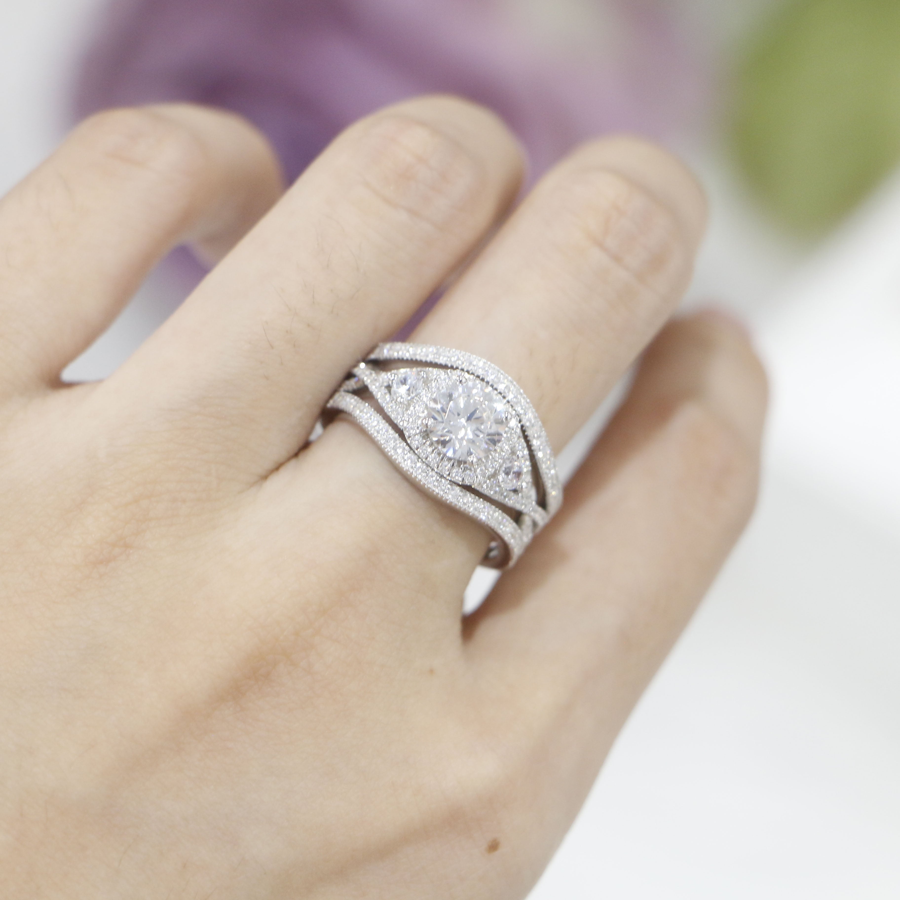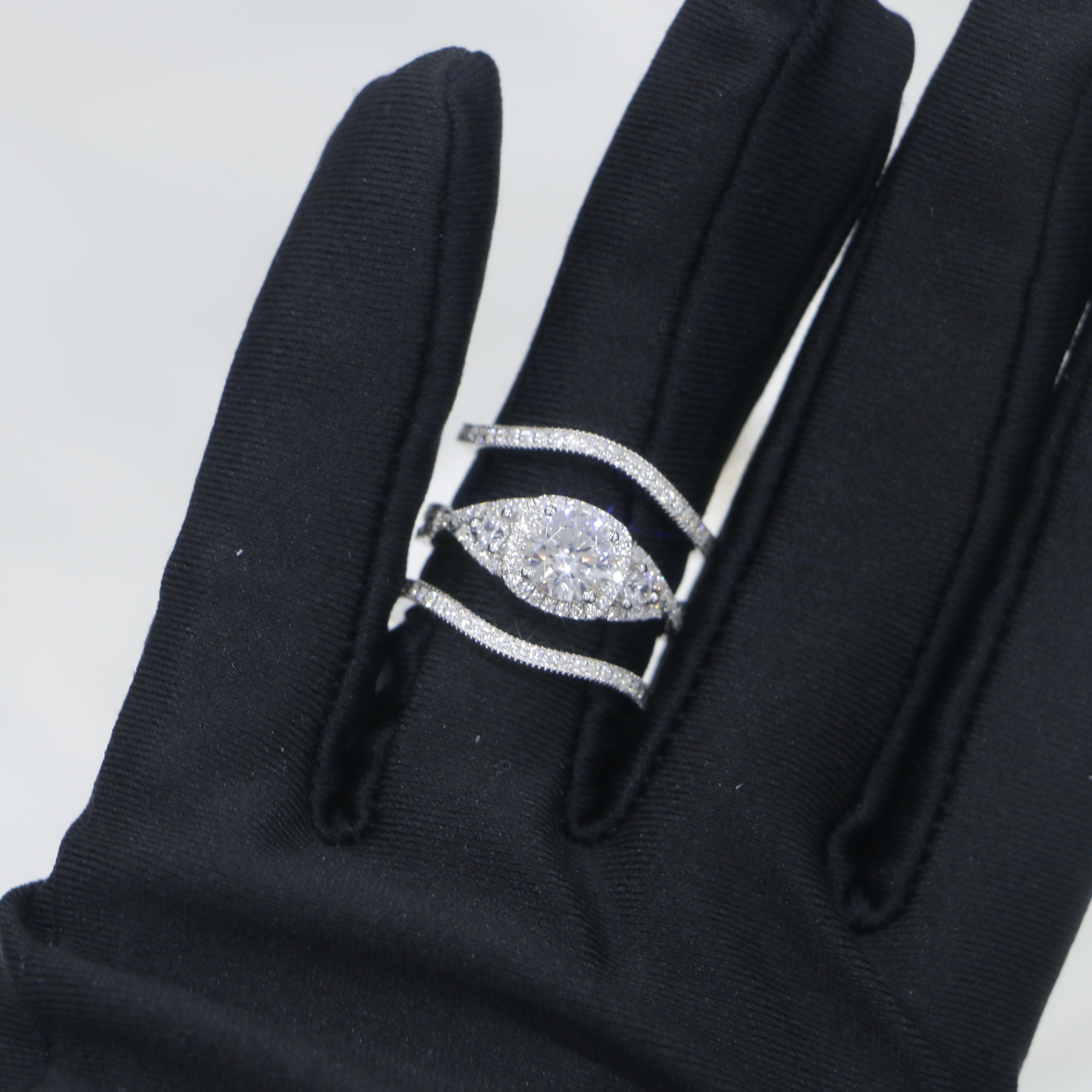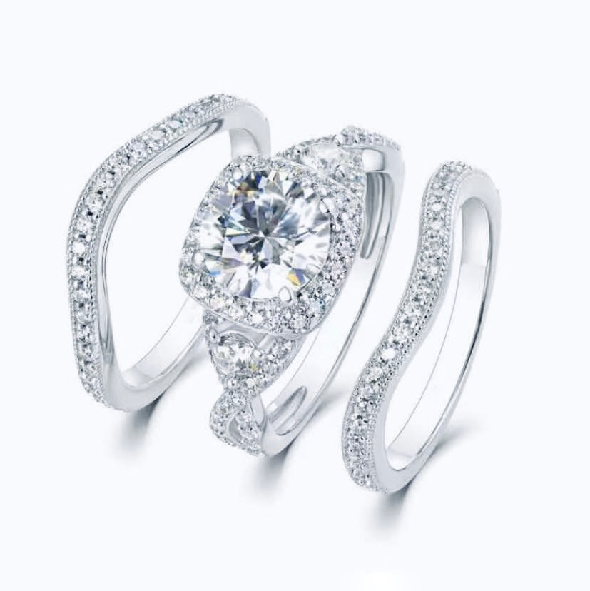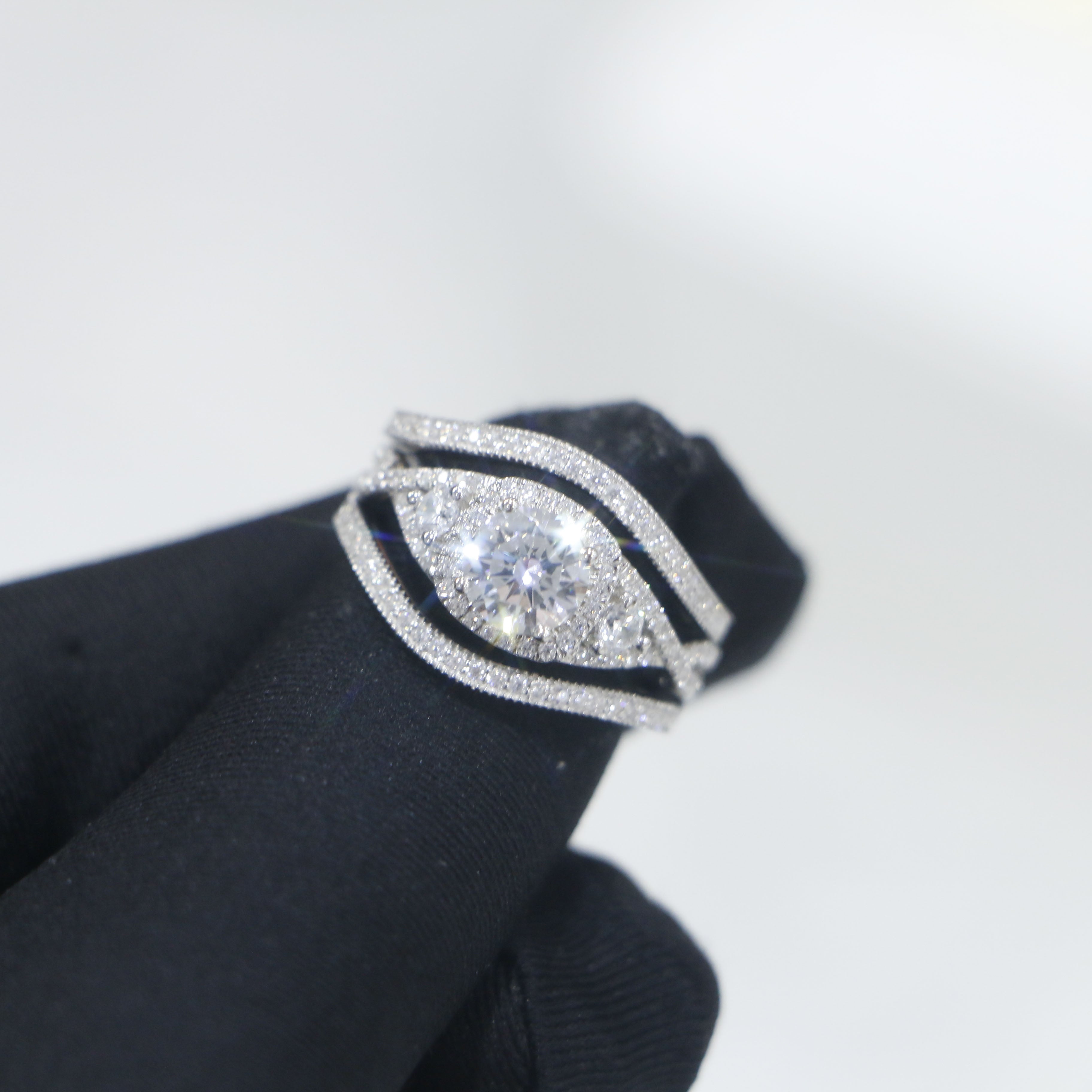 Delicate Design- Center stone is set with 2 carat round cut lab grown stone. This three-piece platinum/silver alloy wedding ring set for her will never be outdated and will make your eyes shine.