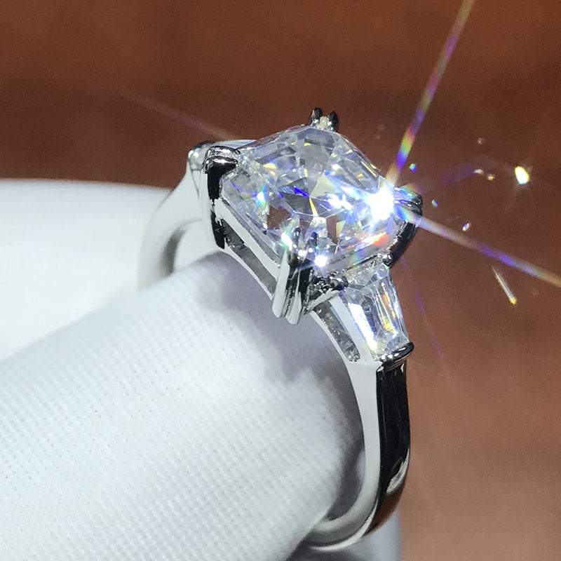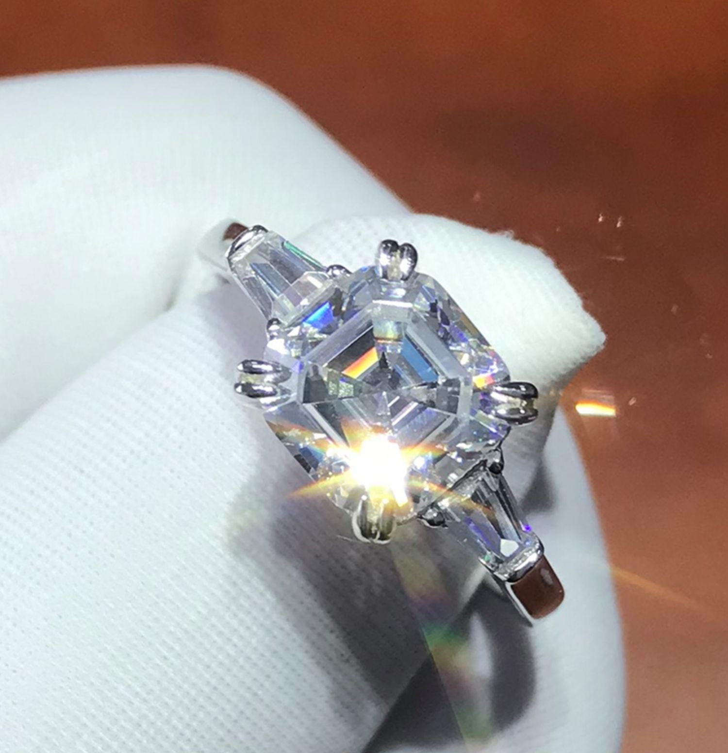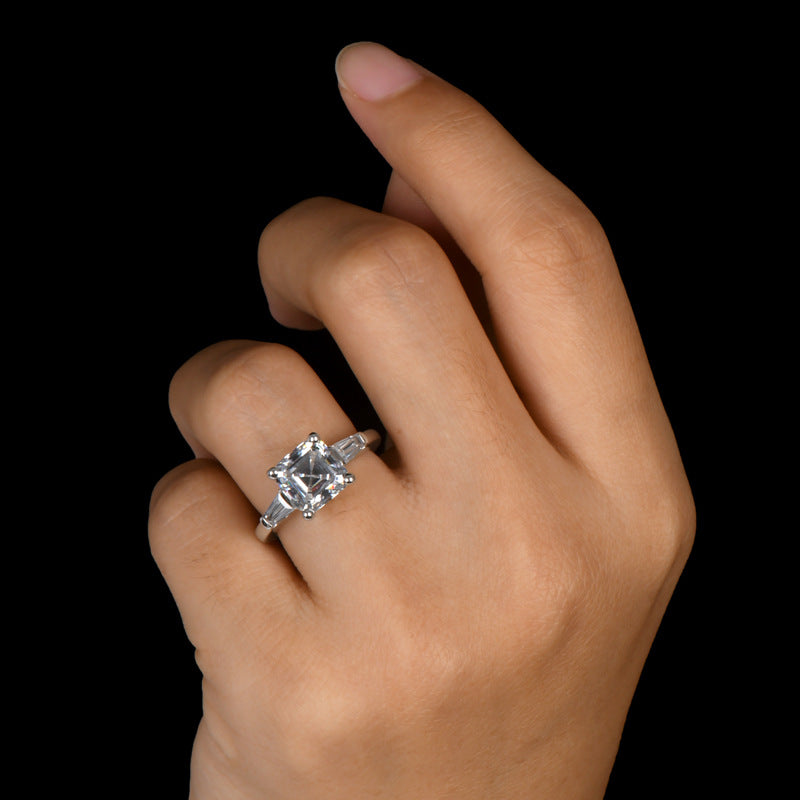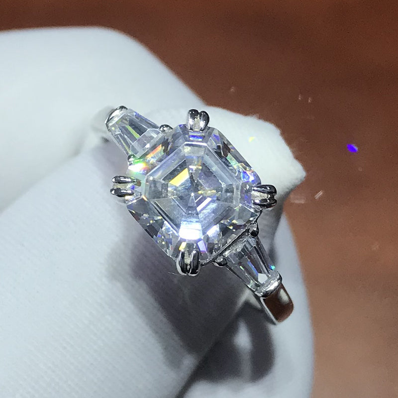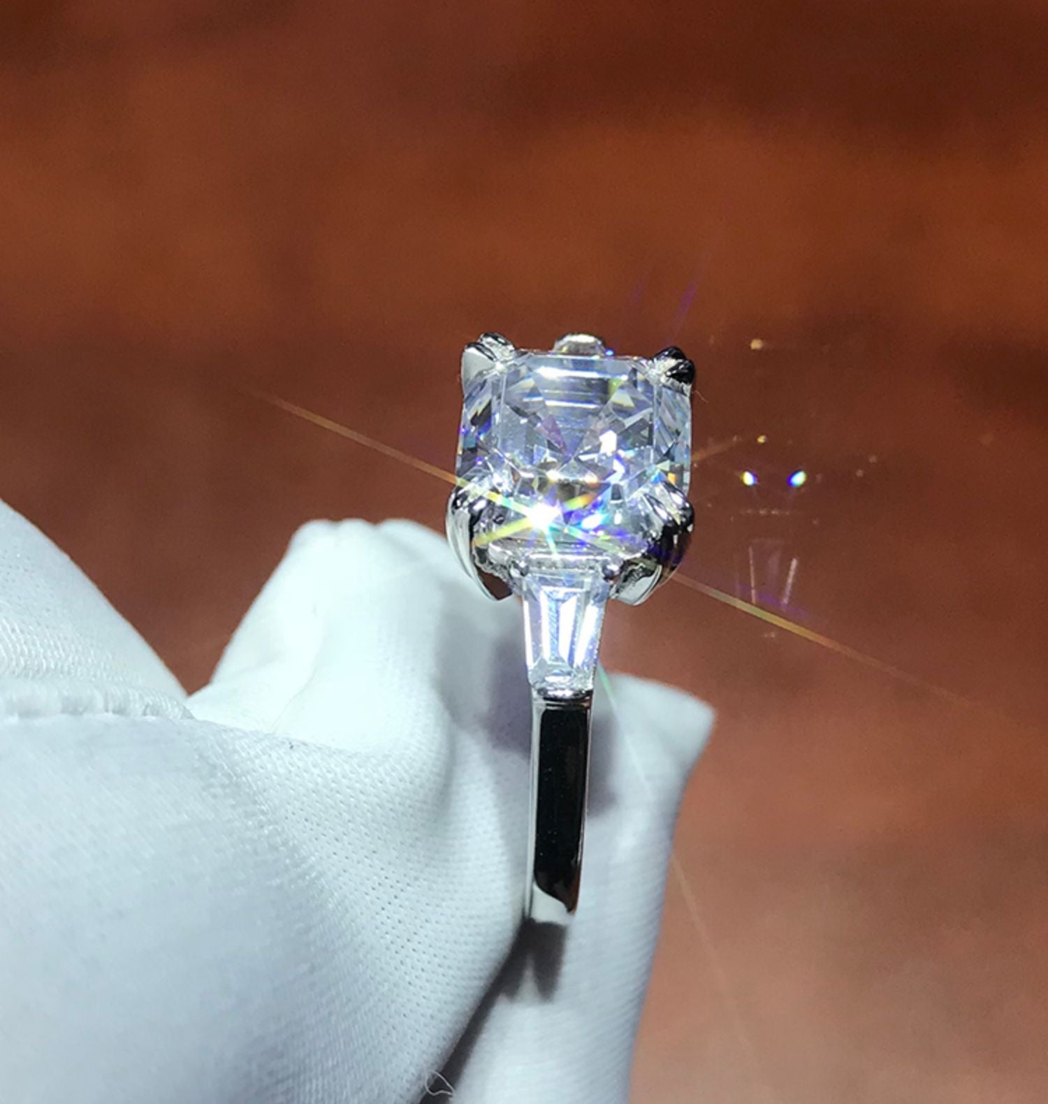 Asscher cut center set with split claw prongs, and paired with tapered bullet side stones; handmade platinum and silver three stone engagement ring.