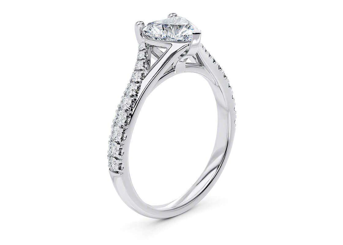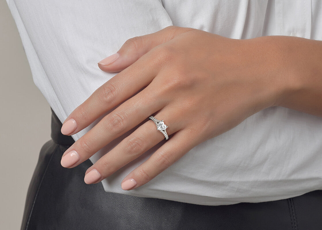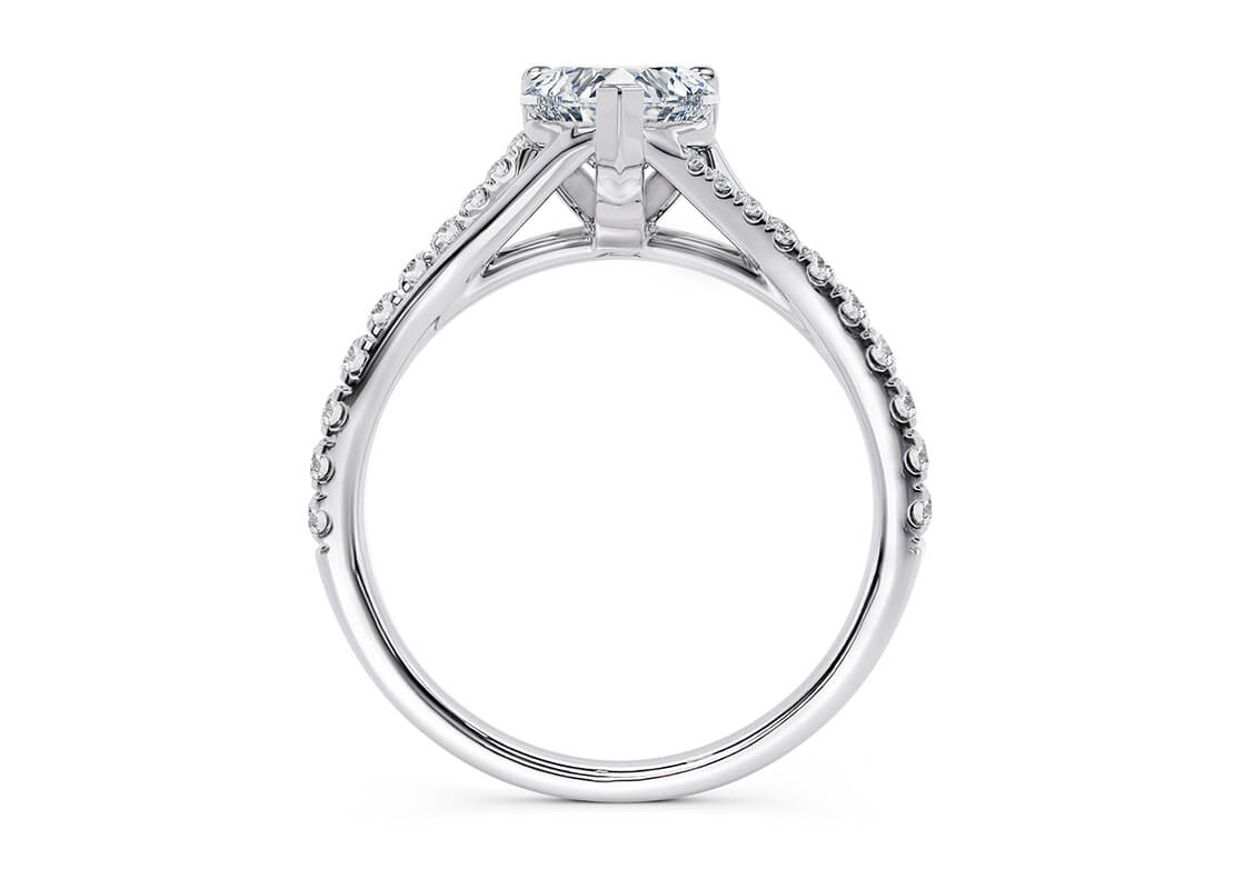 Where symmetry meets elegance, it is this ring. A half-set split stone band leads your gaze to a lustrous centre stone, complemented by two secret stones embedded in the crown.
