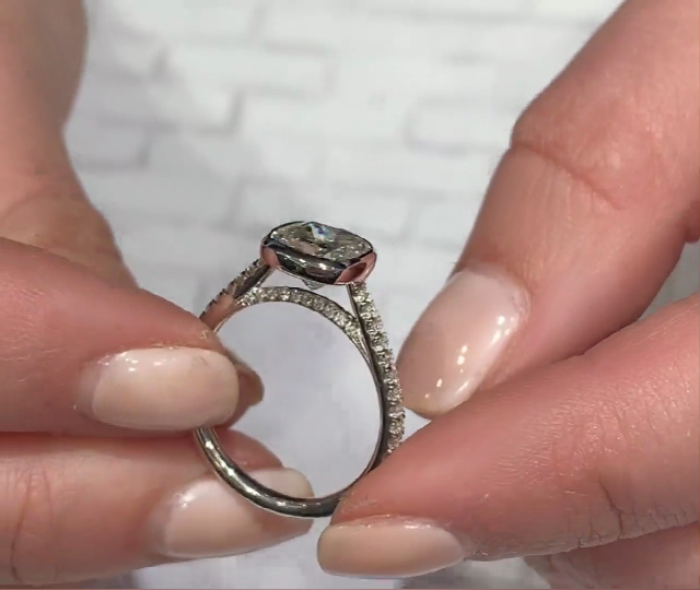 Cushion cut center stone set into a delicate bezel and leading to a micropave band with stones along the gallery; handmade engagement ring design.