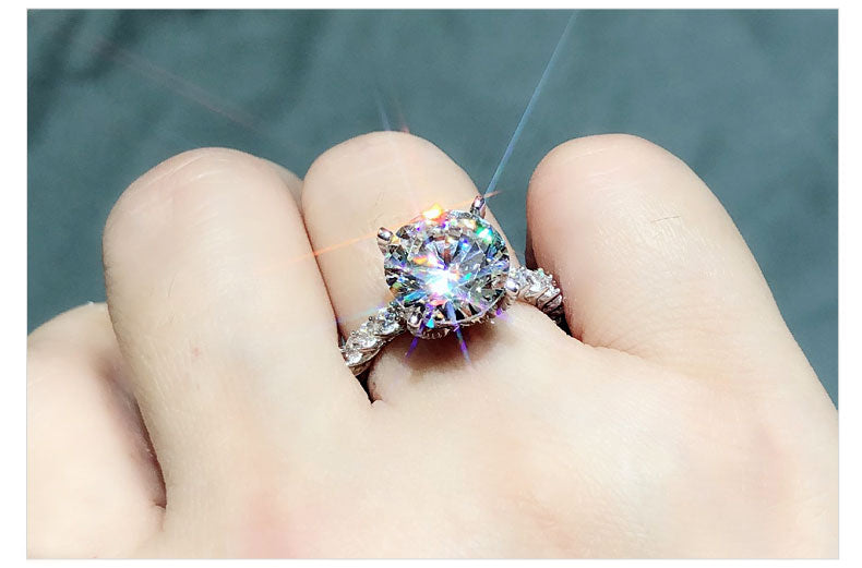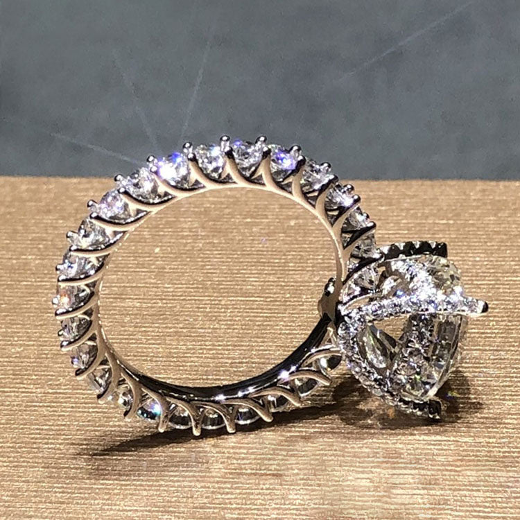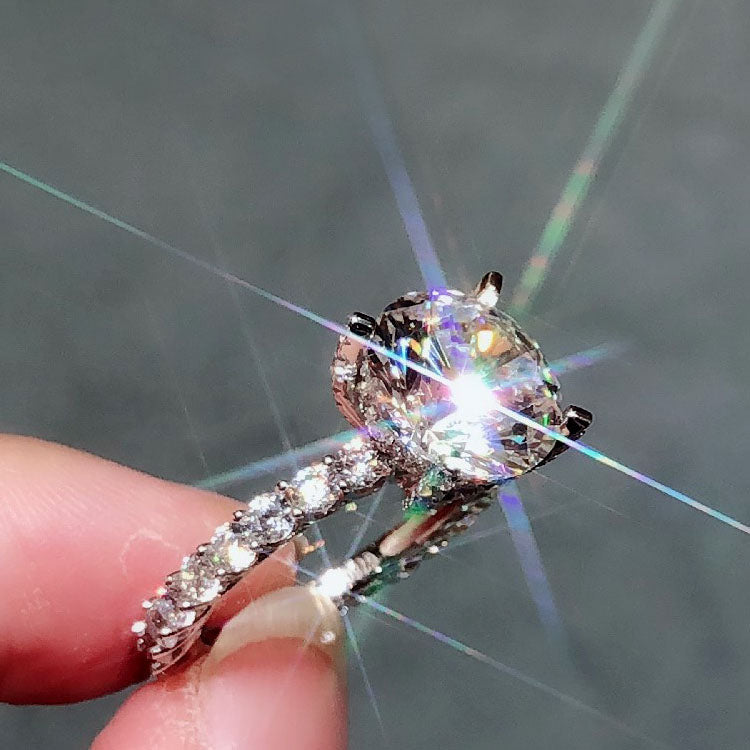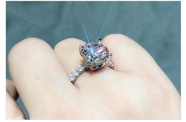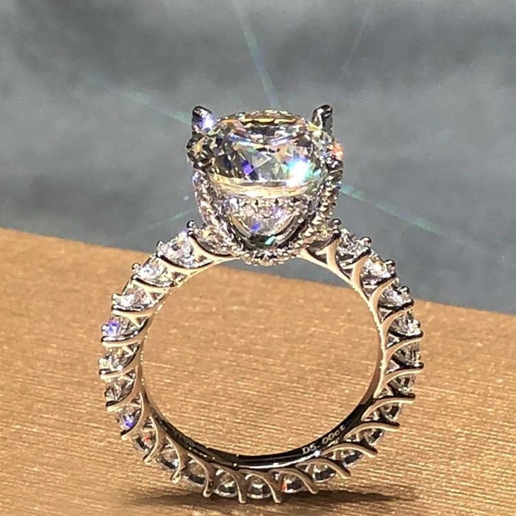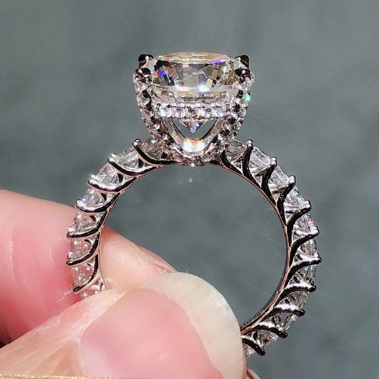 This timeless engagement ring is a classic way to ask her for hand. The center stone is classic four prong setting. Full circle stones on the ring band makes it stunning from any angle.