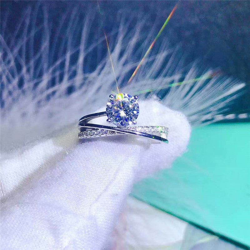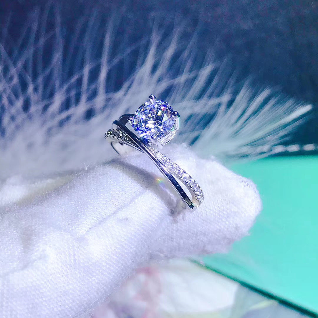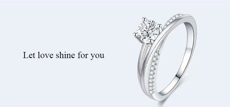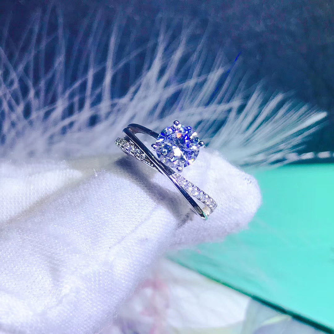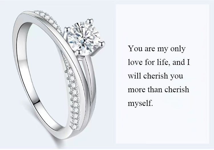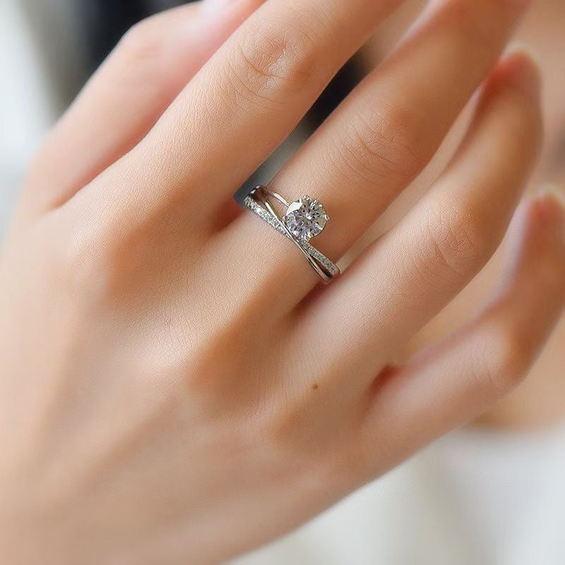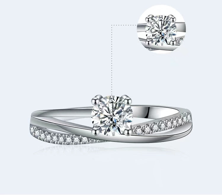 The center stone is set with four prong, classic but never out of date. The band is crossed, noble and elegant.