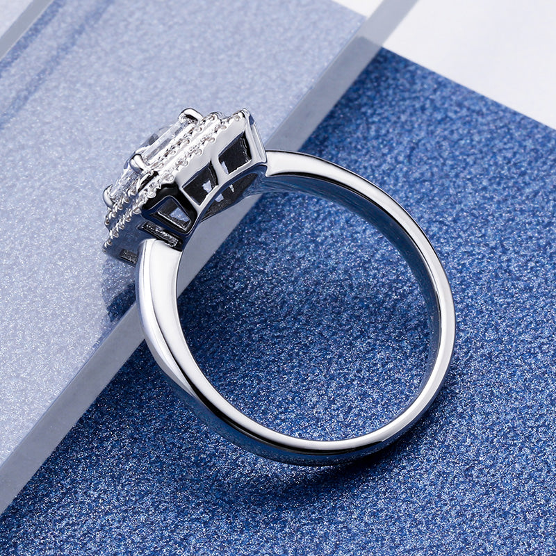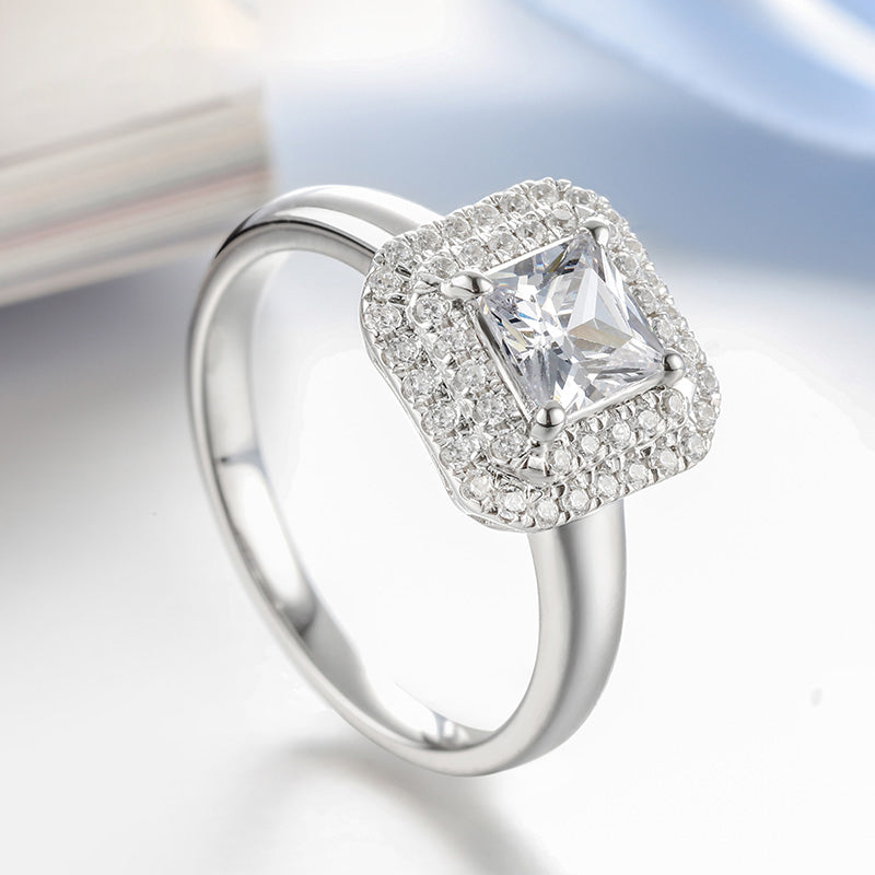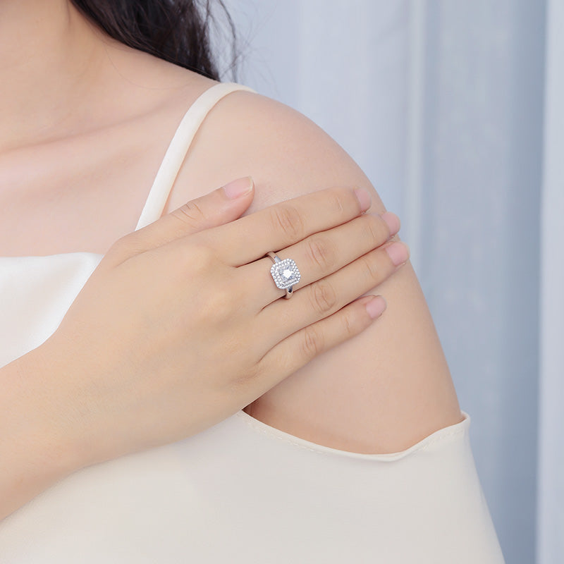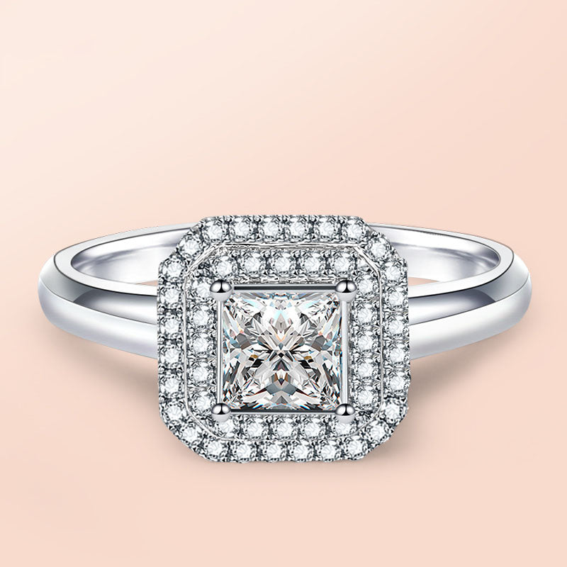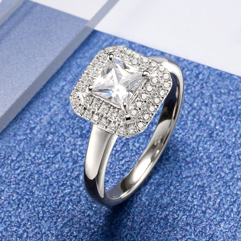 The center stone is classic four prong setting, surrounded by geometric model Square halo, it appears bigger than the carat.