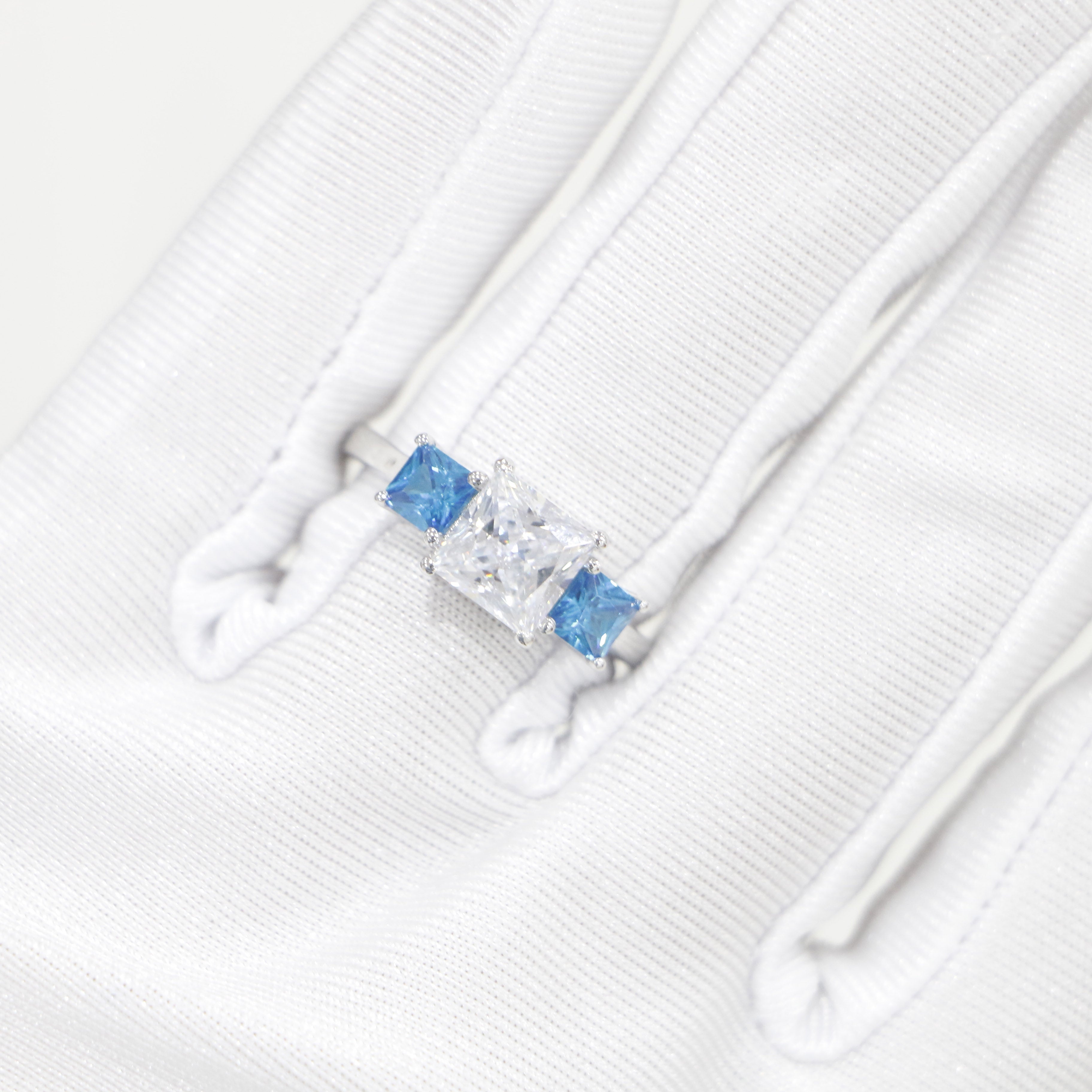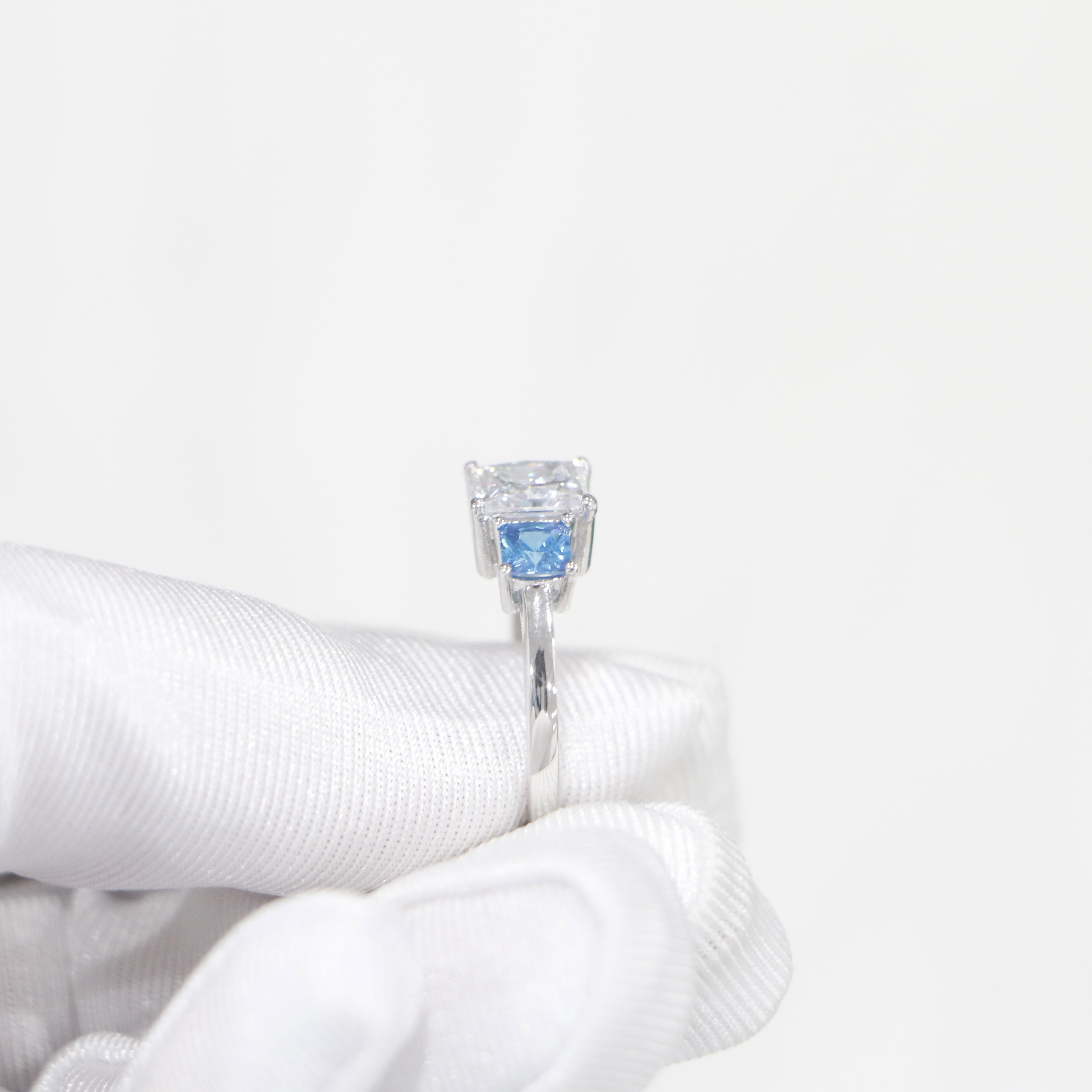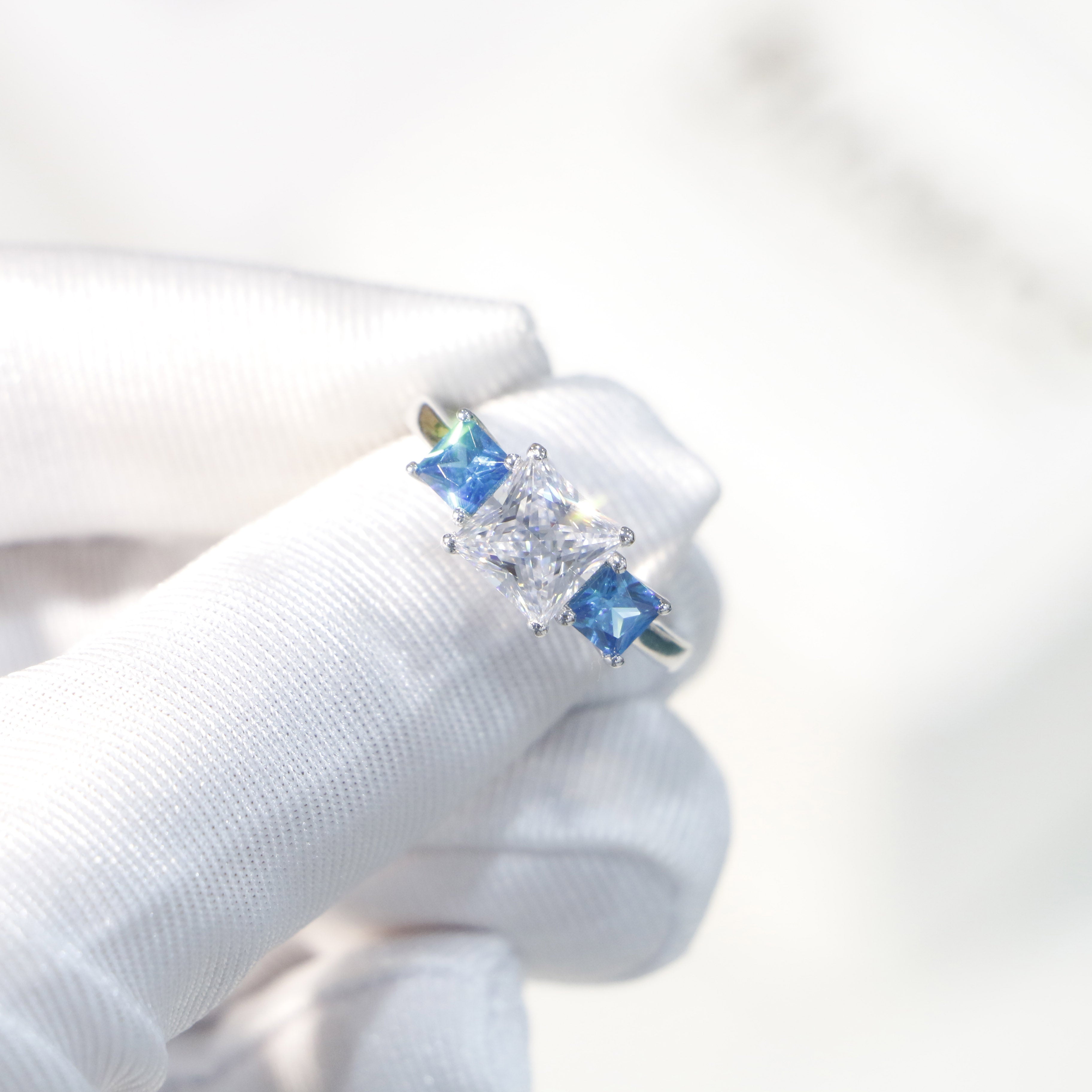 All with a minimum color D and a minimum clarity VVS1. Elegant sapphire and UNA three stone ring crafted in 30% platinum and 70% silver.