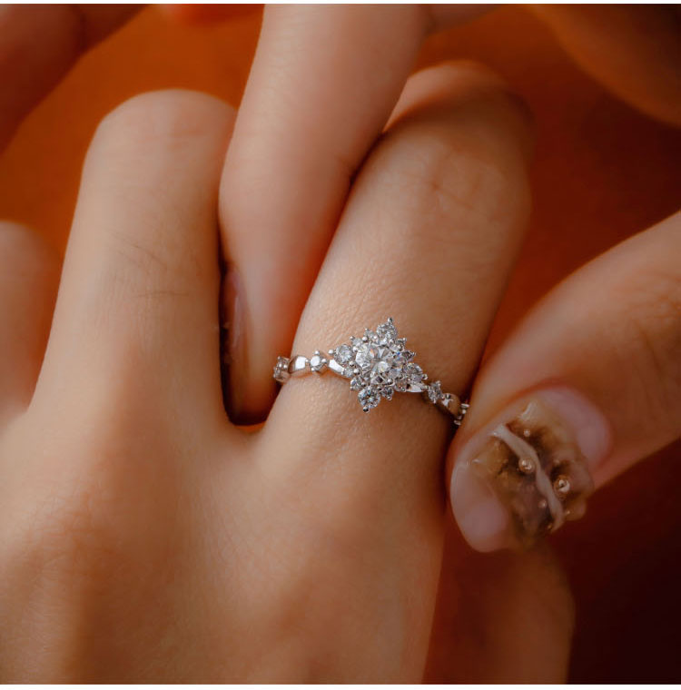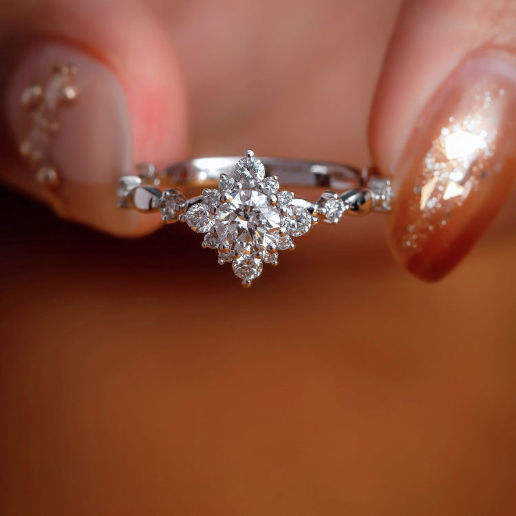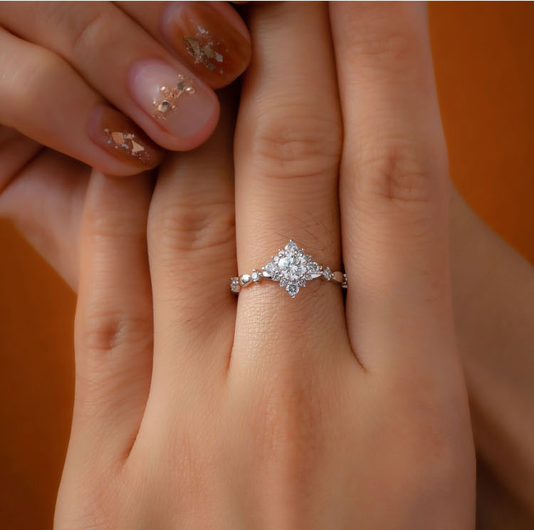 The center stone is round cut, but the stones around it make it look like princess cut.The ring arm appear three-dimensional and prominent with small stones on both sides.