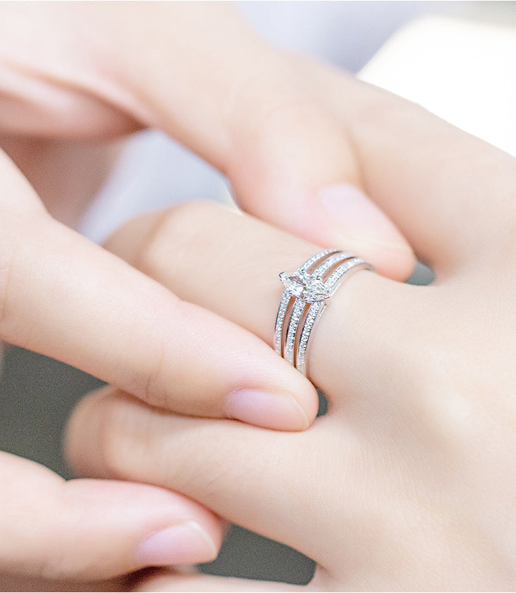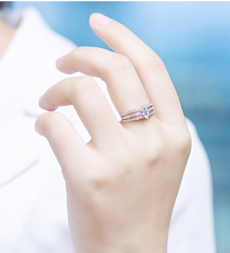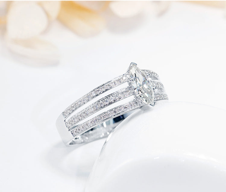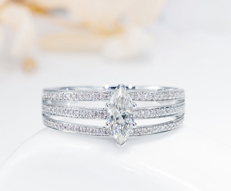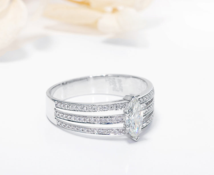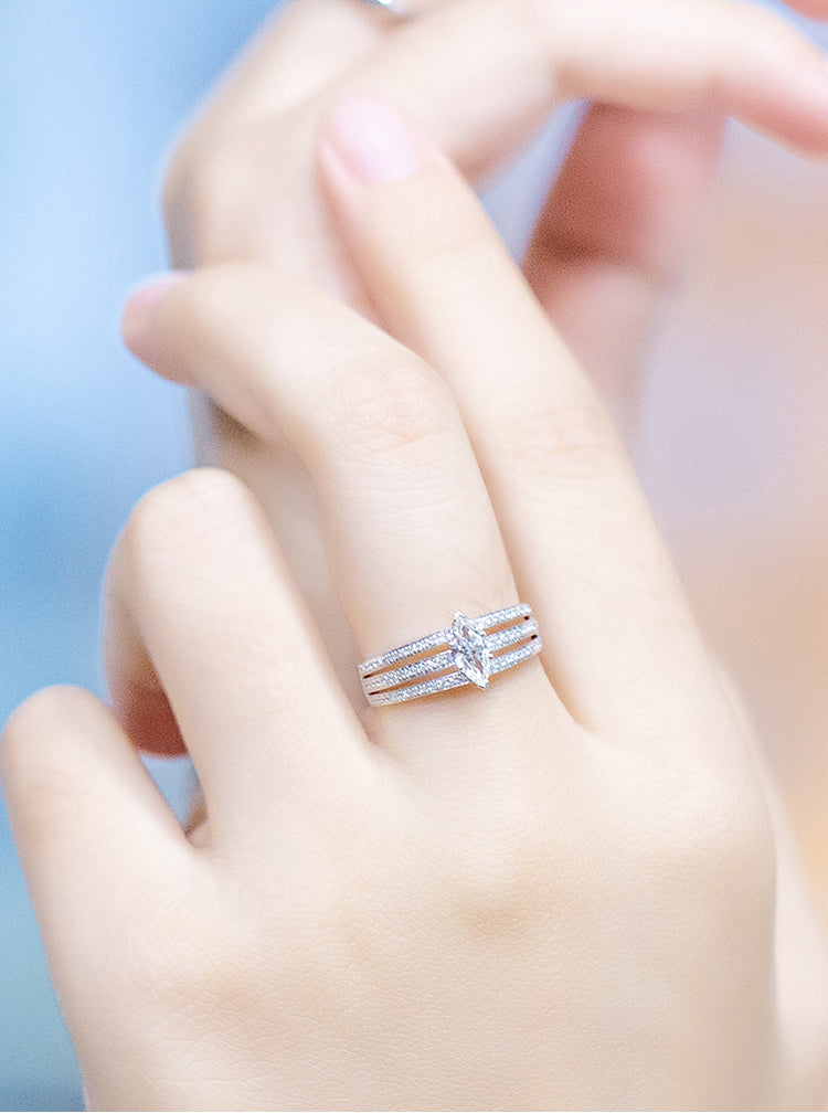 This timeless engagement ring is a classic way to ask her for hand. This ring boasts a marquise shaped that is mounted into a gleaming band.(The ring on the model's hand is 0.3ct)