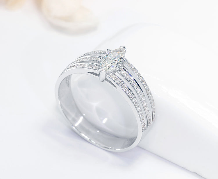 Three rows ring bands embraces and accentuates the center fancy shaped stone of this brilliant ring. The center stone accents on the band add a truly dazzling effect.